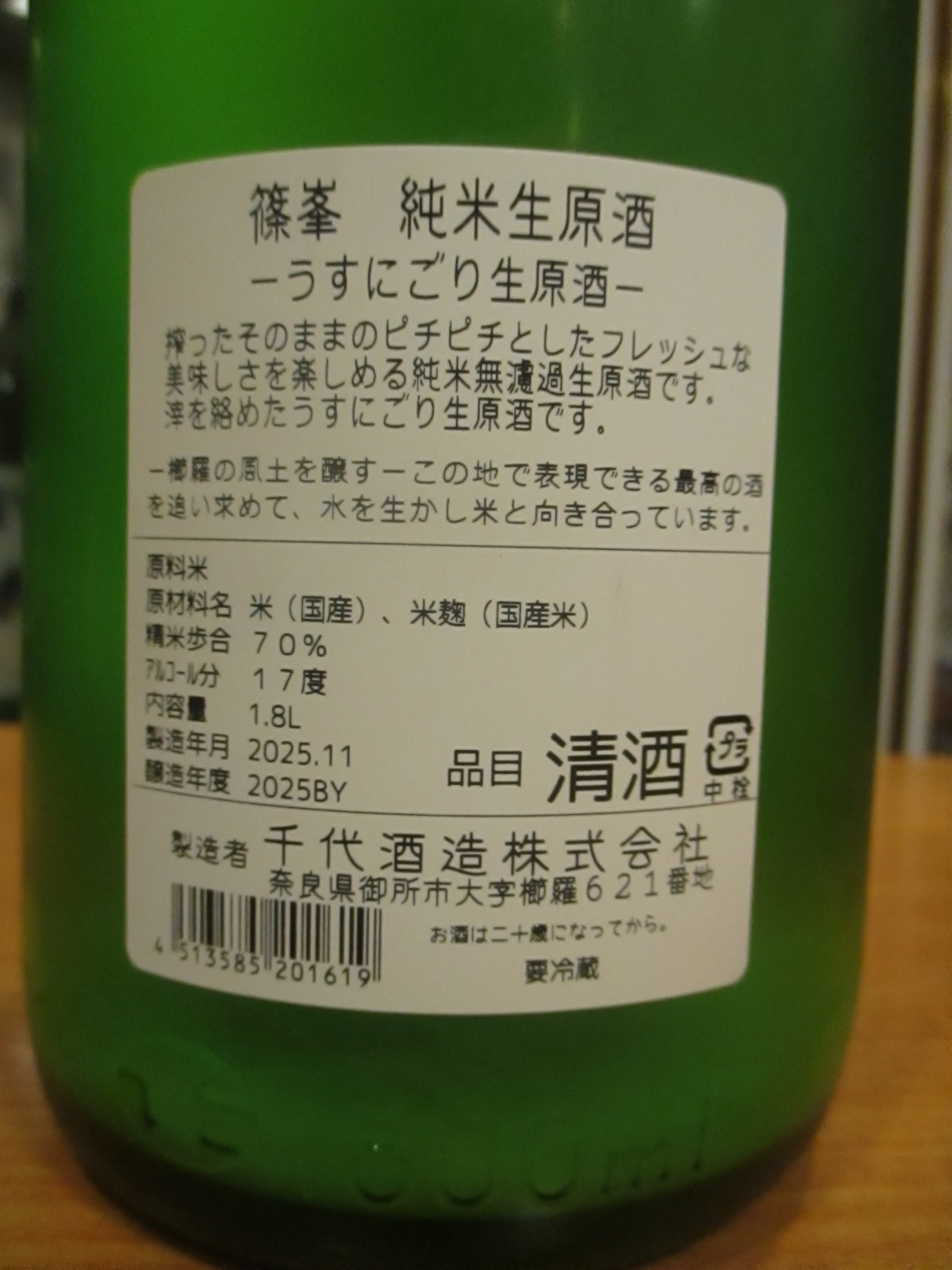 篠峯 純米うすにごり生原酒 2025BY 1800ml瓶 千代酒造