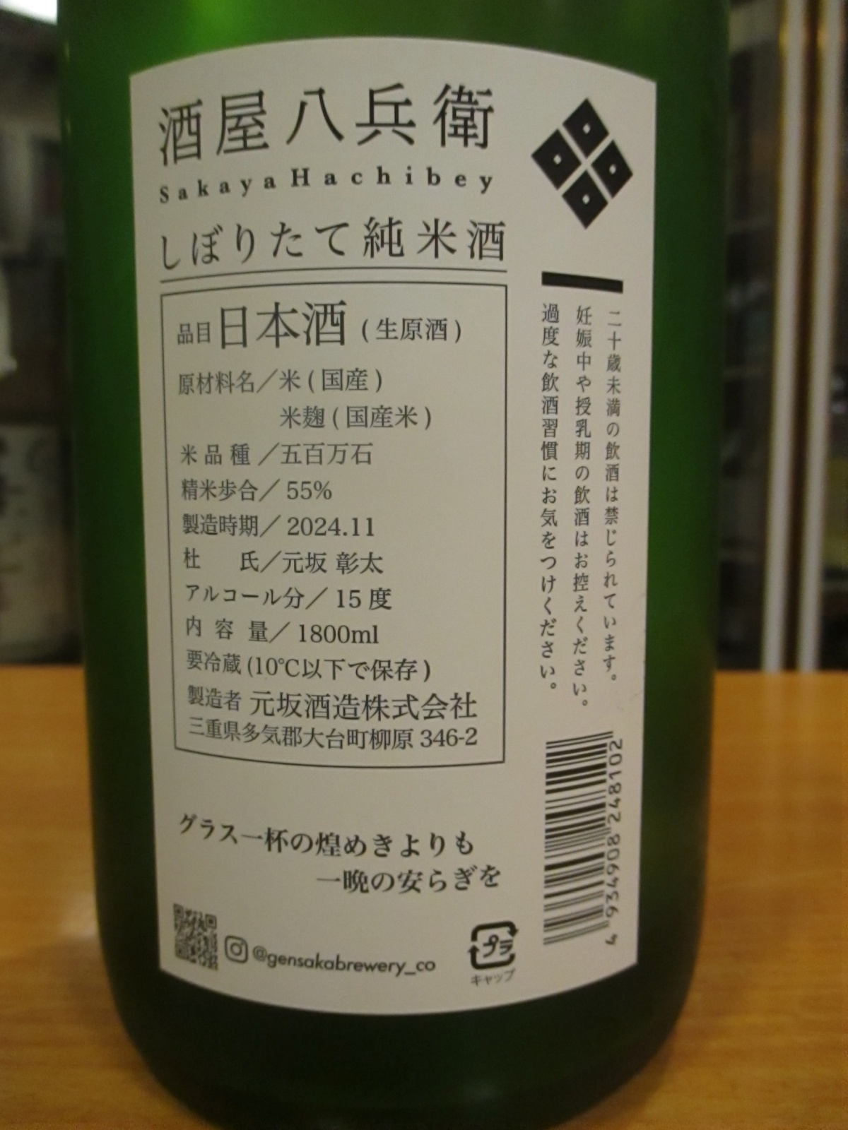 八兵衛 純米しぼりたて生酒 2025BY 元坂酒造 1800ml瓶